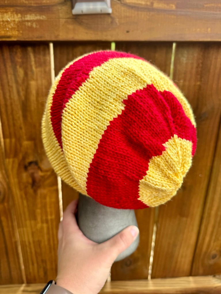 Back from vacation, I decided to take my turns at reorganizing my Chiefs Hat. I started my basic recipe with the yellow instead of the red. I am a little nervous at this stage because before the fold….it looks an awful lot like my original hat.