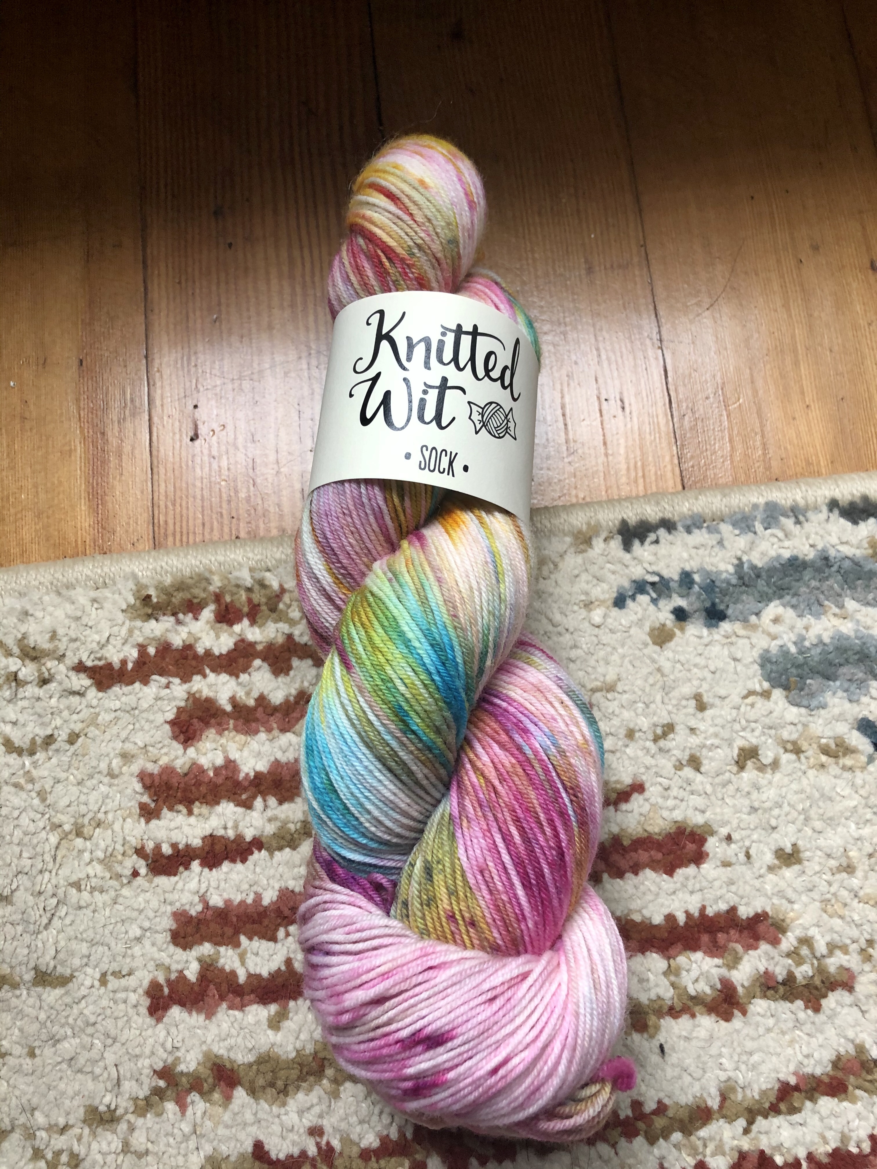 Knitted Wit Sock in Unicorn Giggles. I think this will be just a fun pair of blueberry waffle or vanilla toe up socks for me. The rainbow colors just make me happy!