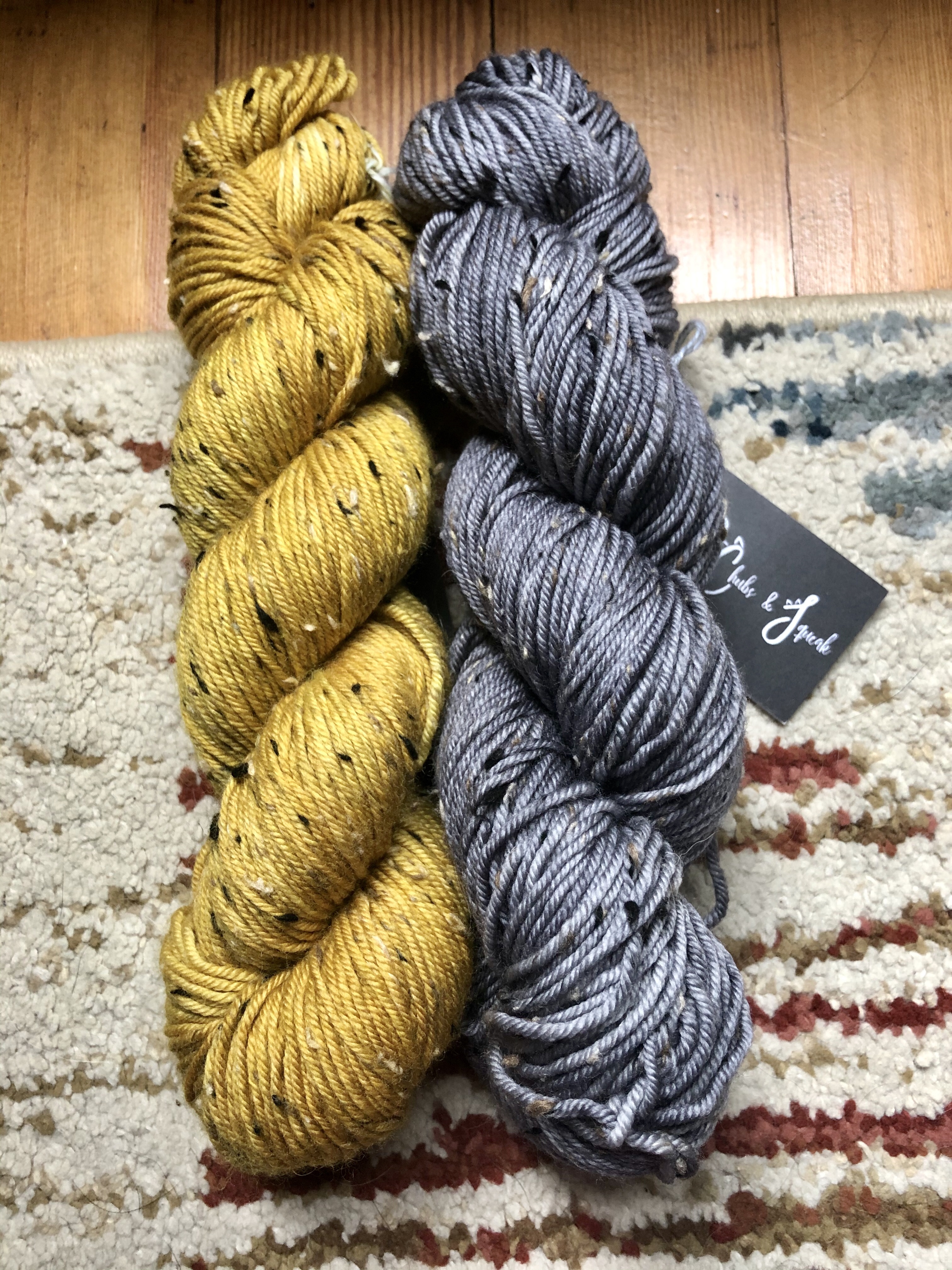 The tweedy yarn will be a two color shawl, the Hazel Knits in green hues will be some sort of a faded project, the Twine will be combined with existing stash for a shawl and the Knitted Wit will be happy socks for my feet.