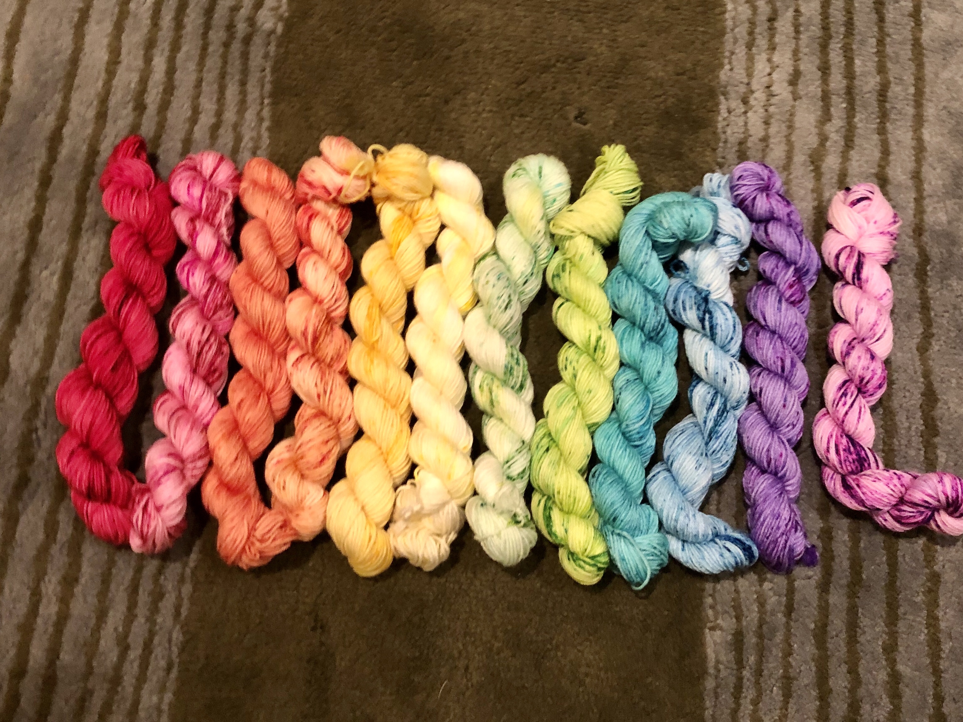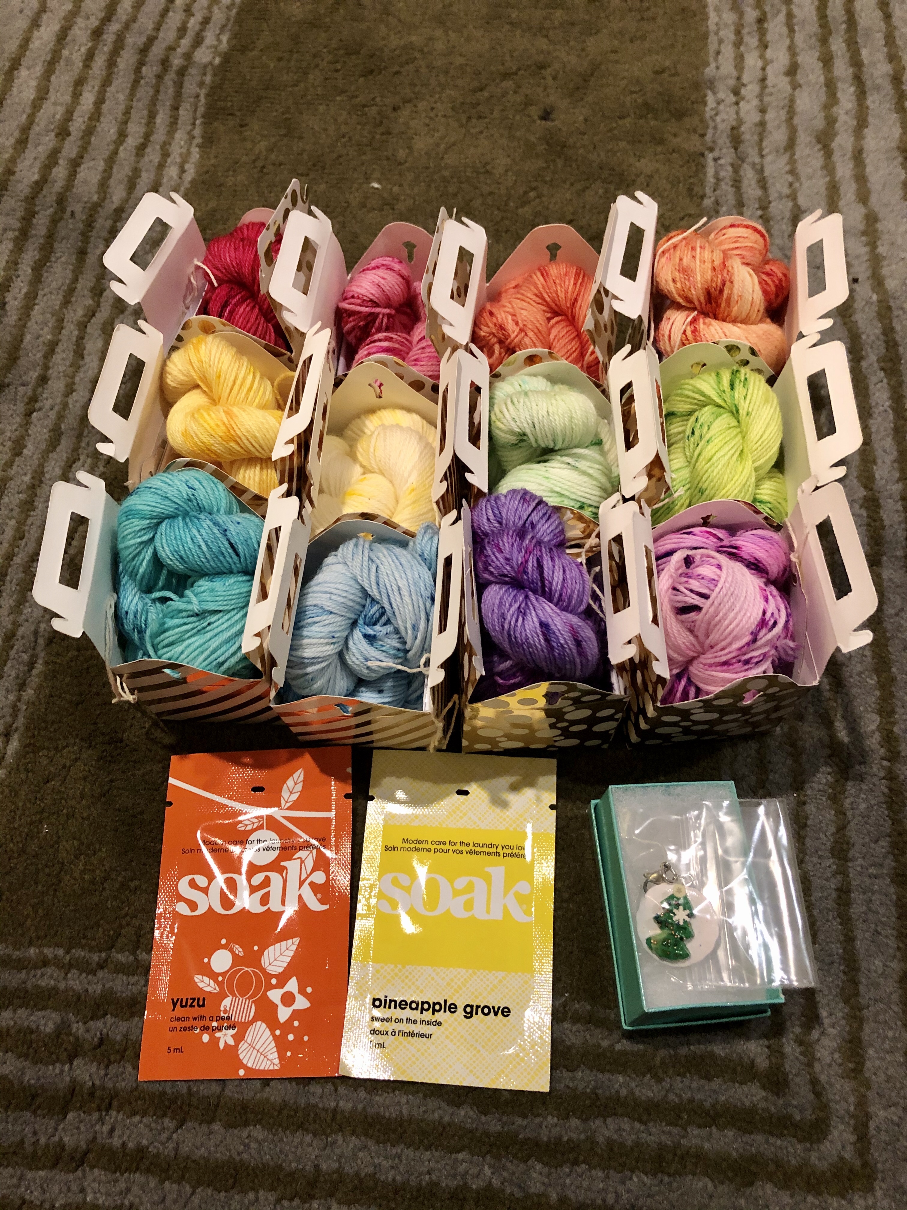 This was my second “advent” calendar of 12 minis. I didn’t have the budget on hand this summer to buy a full 24 skein advent from any one dyer but I did manager to sleuth out two 12 skeins advents for less than price of a full one. And boy did this one not disappoint!I keep smelling the soak and having to hid the stitch marker from my children.