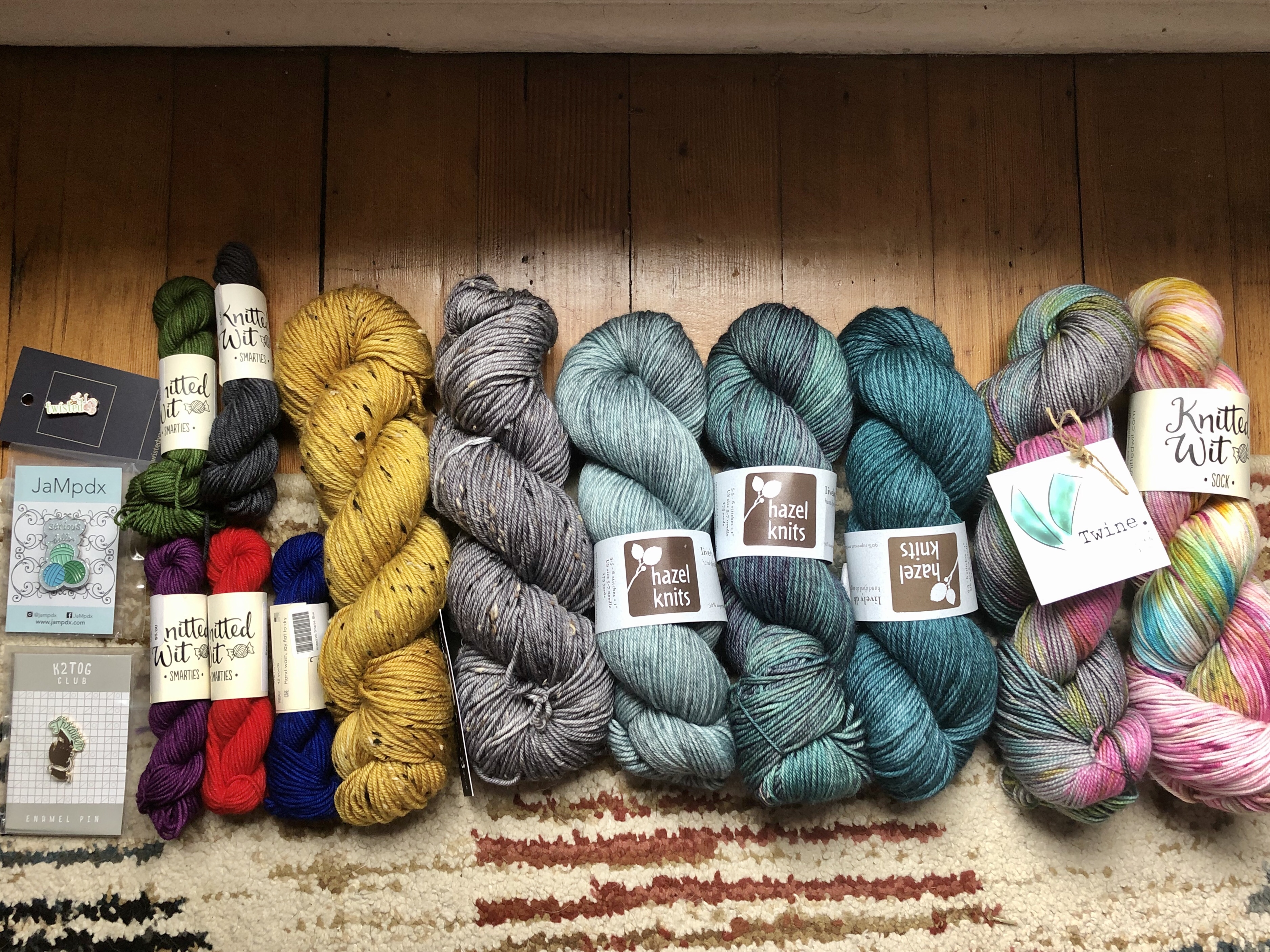 I might have spent my budget plush some but it was totally worth it. I grabbed a mix of sock yarn, DK and worsted. I had some Uneek Worsted in a self striping pattern (top), La Bien Aimee BFL Sock, Life In the Long Grass Fine Sock, Madeline Tosh DK, Madelinetosh Pashmina, and two skeins of Spin Cycle!