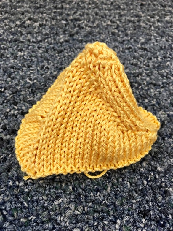 Un-stuffed it looks like a weird pyramid, lol. But other than some slight laddering between the needles I’m quite pleased. I remembered halfway through how I need to tighten the stitches after switching needles to discourage laddering. So the second one will be better.
