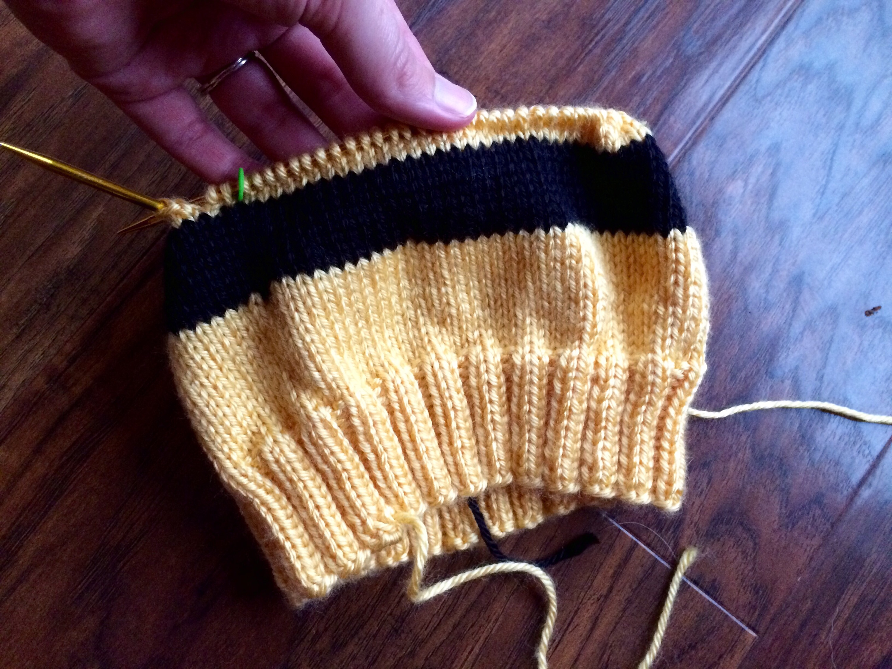 To make sure I could wrap my head around the construction and get used to the size 8 DPN needles, I made an A cup size first. The first of the pair flew off my needles in one evening!
